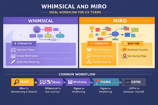 Whimsical is awesome for fast flows and simple screens. Miro is stronger for team workshops, research synthesis, and mapping large user journeys on an infinite canvas. Real-world UX teams in 2026 still use this combo heavily during discovery.